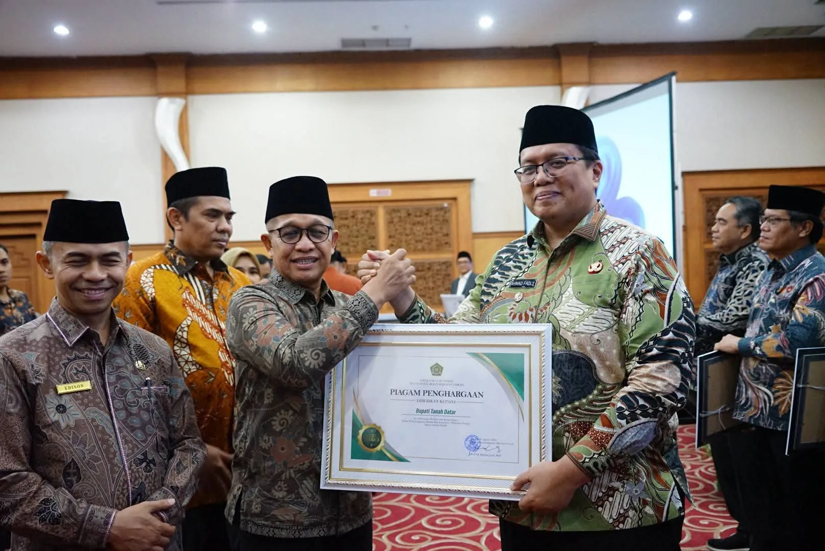 Kementerian Agama memberikan piagam penghargaan kepada seluruh Kepala Daerah se Sumatera Barat termasuk Bupati Tanah Datar yang diterima Wakil Bupati Ahmad Fadly yang malam itu juga didampingi Kakan Kemenag Tanah Datar Amril.Piagam Penghargaan ini diberikan atas dukungan, dedikasi dan kerjasama Kepala Daerah dalam penyelenggaraan ibadah haji embarkasi/debarkasi Padang tahun 2025.
