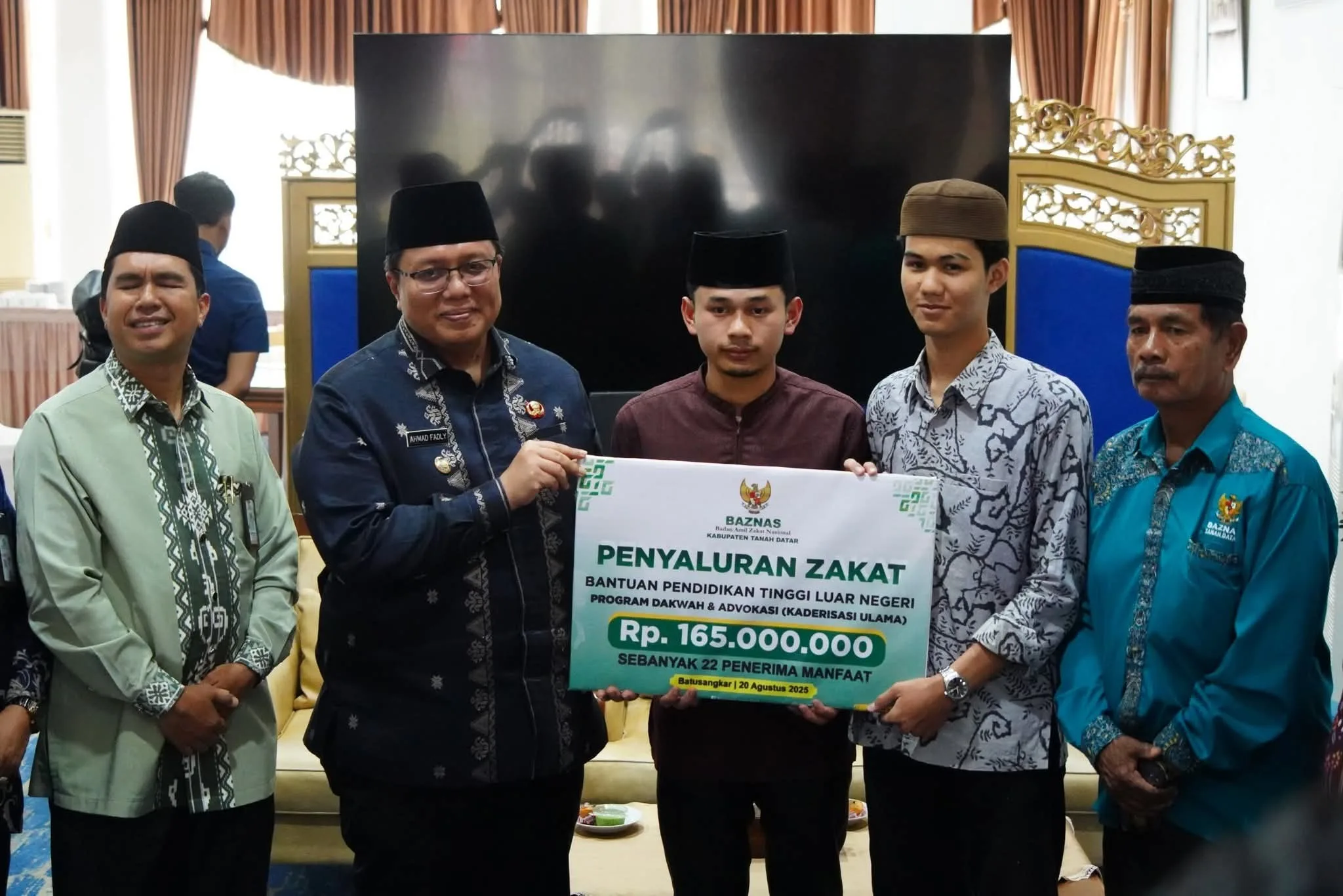 TANAH DATAR, Bacalahnews - Wakil Bupati Ahmad Fadly menyerahkan pendistribusian zakat dalam bentuk program kaderisasi Ulama ke Universitas Al Azhar Kairo, Mesir dan Maroko sebanyak Rp165 juta untuk 22 orang, di Gedung Indojolito, Batusangkar, Rabu (20/8/2025).Kagiatan itu pun, dimaksudkan untuk membantu mereka agar mampu melanjutkan pendidikan kepeguruan tinggi melalui program yang dicanangkan Badan Amil Zakat Nasional (Baznas) Tanah Datar tersebut.