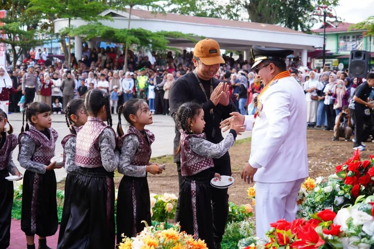 TANAH DATAR, Bacalahnews - Ribuan masyarakat Kota Batusangkar memadati Lapangan Cindua Mato (LCM) guna menyaksikan pertunjukan sebelum upacara penurunan bendera merah putih, Minggu (17/8/2025).Berbagai pertunjukkan tersebut turut disaksikan Bupati Tanah Datar Eka Putra, Wabup Ahmad Fadly, Ketua DPRD Anton Yondra, Forkopimda, Ketua TP PKK, ketua GOW, kepala OPD dan undangan lainnya.