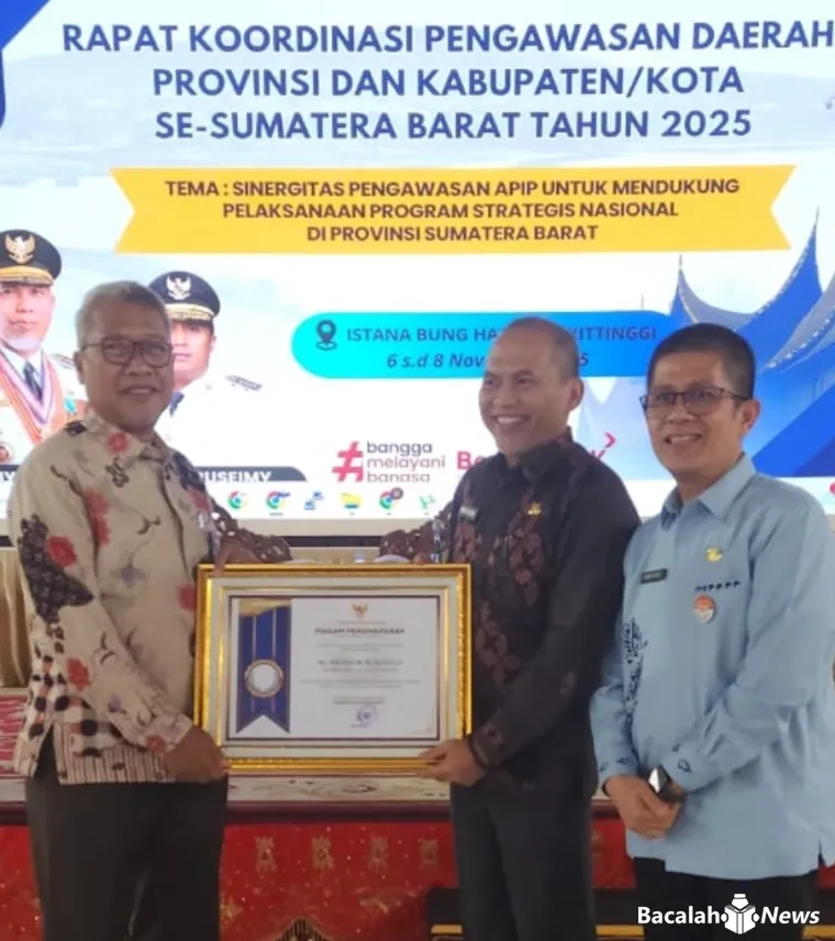 Penghargaan tersebut diberikan Gubernur Sumatera Barat melalui Kepala Perwakilan Badan Pengawasan Keuangan dan Pembangunan (BPKP) Provinsi Sumatera Barat, Arif Ardiyanto, Ak., M.Ak., bersama Inspektur Daerah Provinsi Sumatera Barat, Andri Yulika, S.H., M.Hum., CGCAE.