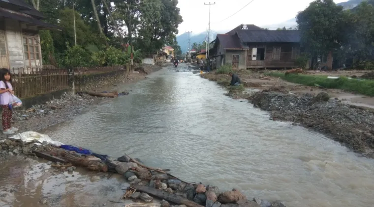 “Air sudah tidak lagi mengalir di sungai. Begitu hujan turun, air langsung menyebar ke mana-mana, bahkan naik ke jalan. Material seperti batu, kerikil, dan kayu ikut terbawa dan menumpuk,” kata Rudi kepada BacalahNews. com, Senin (29/12/2025) pagi.