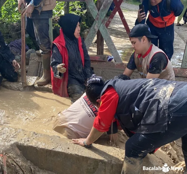 “Ibu Risma pagi ini ikut langsung bergotong royong membersihkan material lumpur bersama warga. Beliau benar-benar turun tangan, tidak hanya memantau,” kata Yogi kepada BacalahNews.com, Kamis (1/1/2026) pagi.
