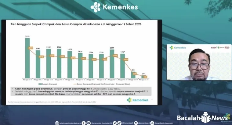 JAKARTA - Kementerian Kesehatan (Kemenkes) RI melaporkan penurunan signifikan kasus suspek dan terkonfirmasi campak di Indonesia. Hingga minggu ke-12 tahun 2026, kasus harian turun drastis sebesar 93 persen, dari puncak 2.220 kasus pada minggu pertama menjadi 146 kasus pada pertengahan Maret.