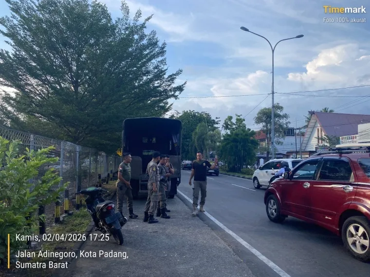 PADANG - Satuan Polisi Pamong Praja Kota Padang menempatkan personel di kawasan Jalan Raya Stasiun Tabing, Kecamatan Koto Tangah, Kamis (2/4/2026) sore untuk mengantisipasi kemacetan akibat aktivitas pedagang kaki lima.