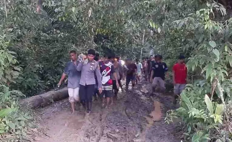 Korban akhirnya ditemukan dalam kondisi tidak bernyawa dan dievakuasi menggunakan tandu manual menuju pemukiman warga.