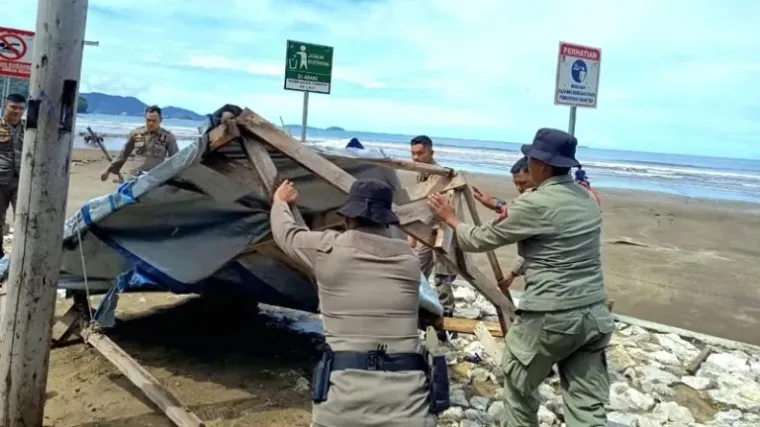 PADANG - Penertiban pedagang kaki lima di kawasan wisata Pantai Air Manis, Kota Padang, kembali dilakukan oleh Satpol PP untuk menjaga ketertiban dan kenyamanan pengunjung, Senin (6/4/2026).