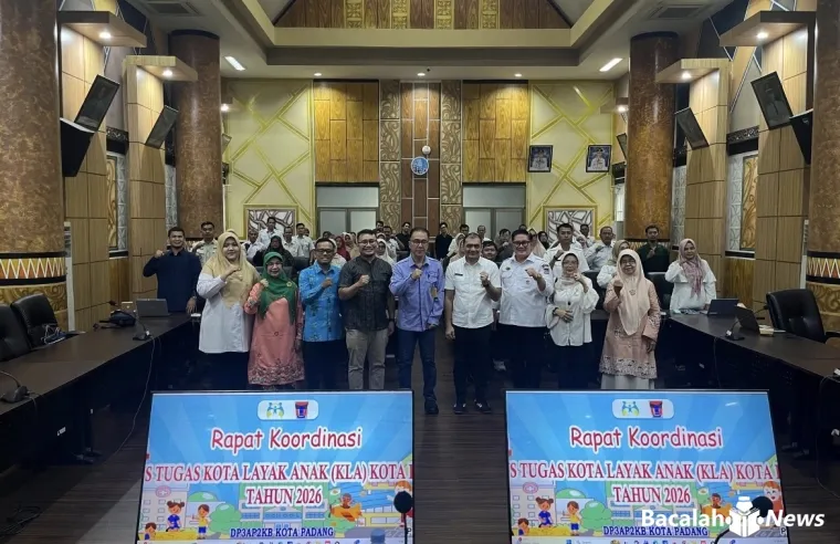 PADANG - Pemerintah Kota Padang menggelar Rapat Koordinasi Gugus Tugas Kota Layak Anak (KLA) 2026 di Ruang Abu Bakar Jaar, Balai Kota Padang, Rabu (15/4/2026). Rakor ini bertujuan memperkuat komitmen bersama dalam rangka optimalisasi nilai KLA 2026.