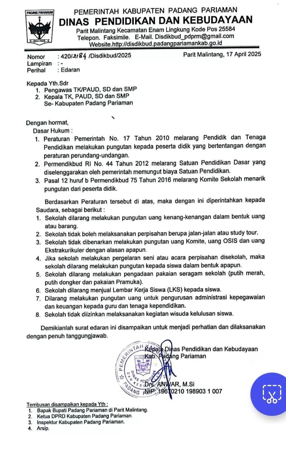 PARIT MALINTANG, PARIAMAN – Dinas Pendidikan dan Kebudayaan Kabupaten Padang Pariaman mengeluarkan surat edaran bernomor 420/2184/Disdikbud/2025 yang menegaskan larangan terhadap segala bentuk pungutan di sekolah, baik di tingkat TK/PAUD, SD, maupun SMP.Edaran yang ditandatangani langsung oleh Kepala Dinas Pendidikan dan Kebudayaan, Drs. Anwar, M.Si pada Kamis (17/4/2025), ini menyebutkan bahwa sekolah dilarang memungut uang kenang-kenangan, uang komite, OSIS, ekstrakurikuler, termasuk larangan menggelar perpisahan berbentuk jalan-jalan atau study tour.
