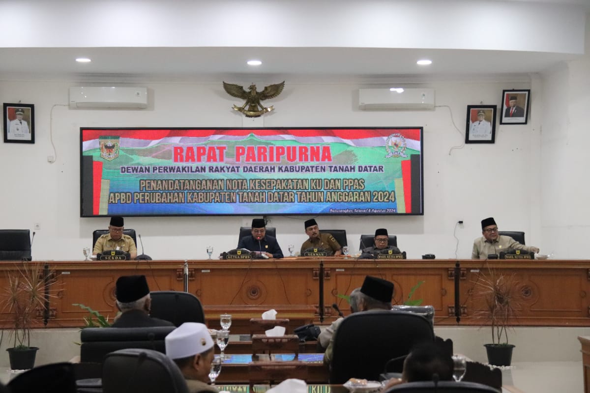 TANAH DATAR, Bacalahnews - Dewan Perwakilan Daerah (DPRD) Tanah Datar menggelar Rapat Paripurna dengan agenda Penandatangganan Nota Kesepakatan Kebijakan Umum (KU) dan Prioritas Plafon Anggaran Sementara (PPAS) Anggaran Pendapatan Belanja Daerah Perubahan (APBD-P) Tanah Datar 2024, di Ruang Rapat setempat, Selasa (6/8/2024).Rapat Paripurna tersebut dipimpin Wakil Ketua DPRD Anton Yondra didampingi Wakil Ketua Saidani dan Ketua DPRD Rony Mulyadi dengan dihadiri 23 anggota, Sekretaris DPRD Yuhardi, disaksikan Forkopimda, Sekretaris Daerah, Asisten, Staf Ahli, Kepala OPD, Camat dan Wali Nagari se-Tanah Datar.