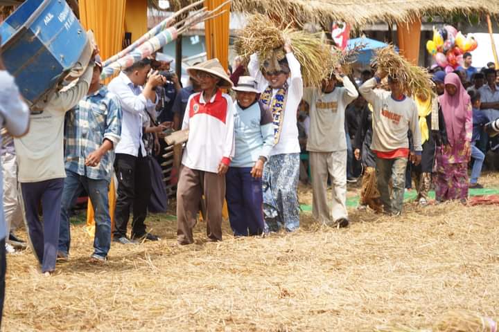 TANAHDATAR, Bacalahnews - Satu Nagari Satu Event Nagari Tanjung, Kecamatan Sungayang, menampilkan Bapulang Padi, Mairiak jo Manongkang padi dalam pembukaan event anak nagari di Hamparan Sawah Bendera, Kamis (1/8/2024).Bapulang Padi itu menampilkan mairiak padi juga manongkang yang merupakan tradisi panen padi di Minangkabau seperti halnya di nagari tersebut.