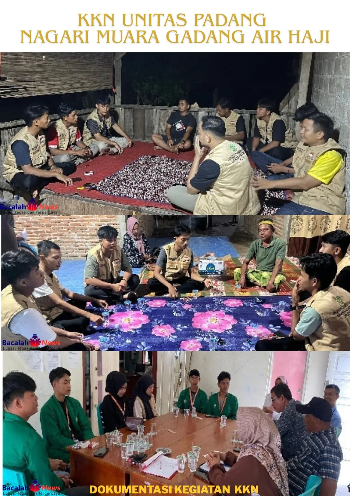 Mahasiswa KKN Universitas Tamansiswa Padang diserahkan secara resmi kepada Wali Nagari Muara Gadang Air Haji. Setelah penyerahan, mahasiswa melakukan pemasangan spanduk di posko KKN dan melakukan sosialisasi serta pengenalan ke rumah warga. Kegiatan diakhiri dengan makan bersama warga, yang menunjukkan keakraban dan kekompakan antara mahasiswa dan masyarakat.Selasa, 15 Juli 2025