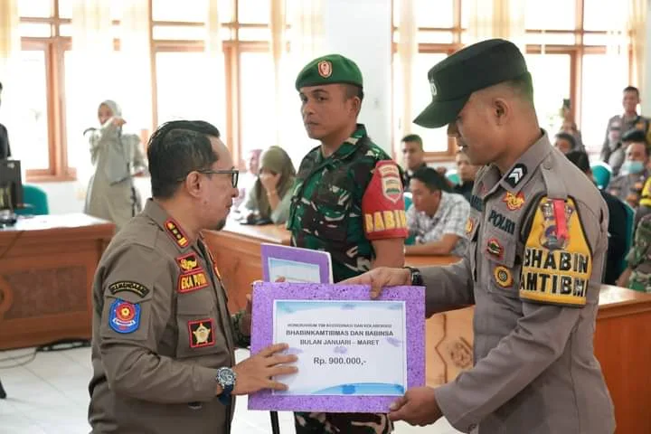 TANAHDATAR, Bacalahnews - Bupati Tanah Datar Eka Putra menyerahkan honorarium Tim Koordinasi dan Kolaborasi Pemberdayaan Masyarakat dalam Mewujudkan Keamanan dan Ketertiban Bersama Bhabinkamtibmas dan Babinsa Triwulan I 2024, di Aula Kantor Bupati Tanah Datar, Jumat (5/4/2024).Program ini baru tahun pertama dalam masa percobaan, hasilnya terlihat lancar tidak menimbulkan masalah dan muncul gejolak, sehingga direncanakan akan direalisasikan kembali dan akan dinaikan anggarannya, tidak hanya Bhabinkamtibmas dan Babinsa tapi Kapolsek dan Danramil juga akan menerima.