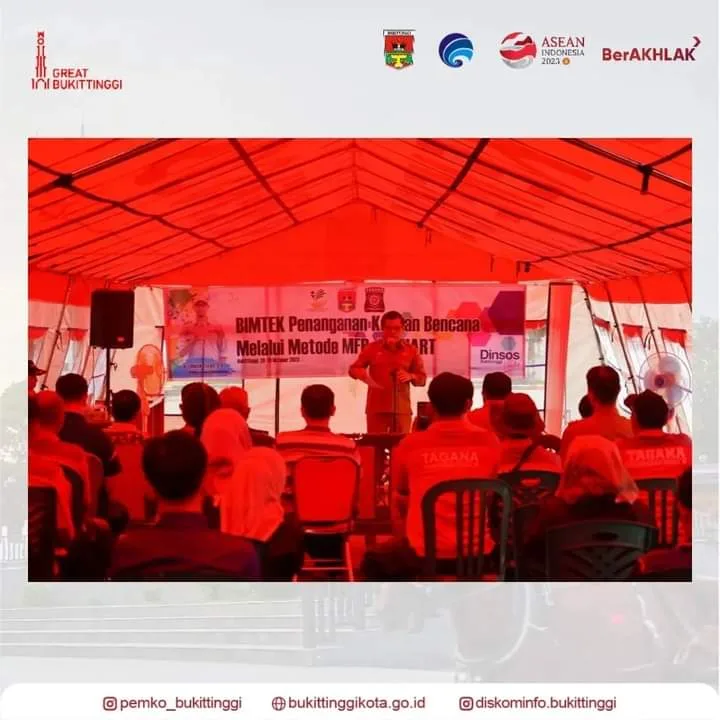 BUKITTINGGI -- Pemerintah Kota Bukittinggi melalui Dinas Sosial, gelar bimtek penanganan korban bencana melalui MFR dan HART.Kegiatan ini dibuka Wali Kota Bukittinggi, diwakili Sekda, di depan Taman Makam Pahlawan Kusuma Bhakti, Senin (30/10/2023).