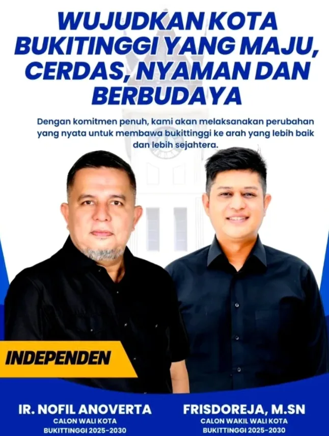 BUKITTINGGI -- Memilih pasangan calon wali kota dan wakil wali kota Bukittinggi, Nofil Anoverta - Frisdoreja di Pilkada 2024, sama halnya masyarakat menginginkan kota Bukittinggi bersih, indah dan nyaman."Kami maju ingin mengujudkan Kota Bukittinggi yang Maju, Cerdas, Nyaman Berbudaya,” ujar Nofil saat berbincang-bincang dengan media ini di salah satu hotel di Bukittinggi, Selasa (10/9/2024).