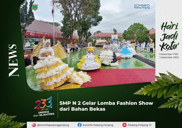 PADANG PANJANG -- Akhir Semester I di SMP N 2 Padang Panjang gelar program class meeting mengusung tema Adiwiyata. Sekolah itu mengadakan Lomba Fashion Show show bertema "Kostum Daur Ulang dari Sampah".Beragam kostum ditampilkan dengan menarik. Gaun-gaun yang dipakai perwakilan kelas dirancang wali kelas dan tim desain masing-masing.