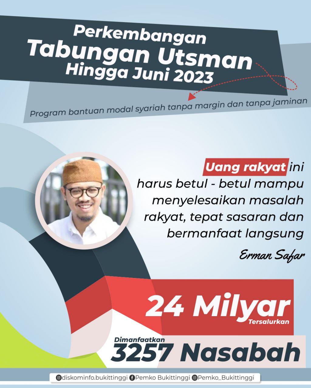 BUKITTINGGI - Tabungan Utsman terus menjadi program unggulan bagi Kota Bukittinggi. Tercatat realisasi dari launcing tahun 2022 hingga tanggal Juni 2023 terdata terdapat 3.275 nasabah Tabungan Utsman dengan plafon anggaran hampir Rp 25 milyar.Wali Kota Bukittinggi, Erman Safar, didampingi Direktur BPR Syariah Jam Gadang, Fery Irawan, menjelaskan, Tabungan Utsman dari launcing tahun 2022 hingga Juni tahun 2023 sudah 3275 pedagang kecil sudah memanfaatkan Tabungan Utsman, bantuan modal syariah tanpa margin dan tanpa jaminan, sebanyak Rp 24.924.800.000,- sudah tersalurkan dari tanggal 20 Januari 2023, hingga 4 Juni 2023, tercatat 1456 nasabah Tabungan Utsman dengan jumlah plafond Rp 13 milyar lebih.
