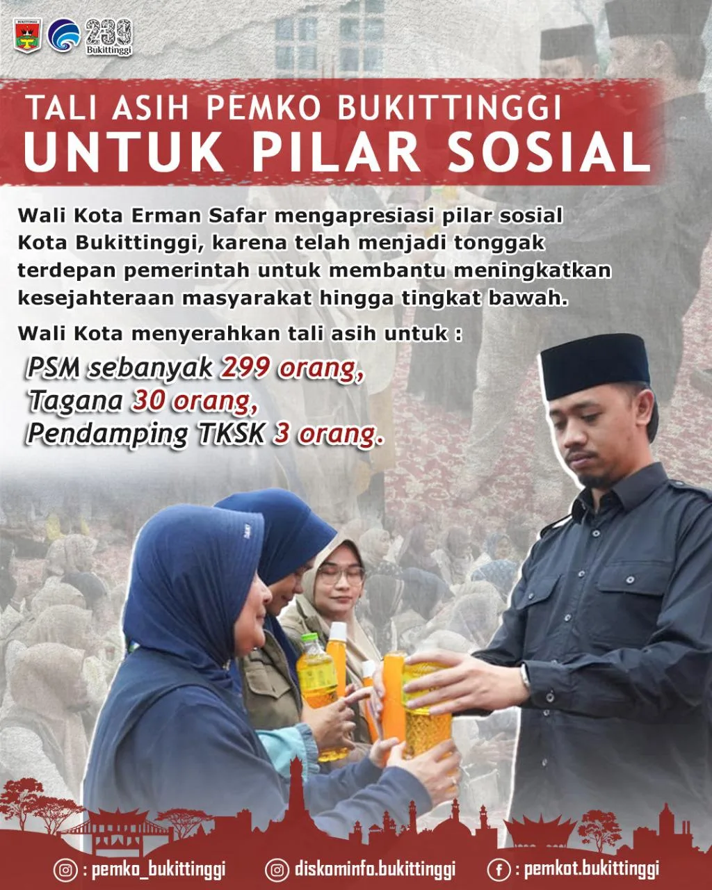 Wako menambahkan, evaluasi dan penyerahan tali asih ini, dilaksanakan dalam rangka peningkatan kualitas Pilar-Pilar Sosial Kota Bukittinggi guna tercapainya penyelenggaraan kesejahteraan sosial yang lebih merata dan tepat sasaran. Wako juga menyerahkan tali kasih untuk PSM sebanyak 299 orang, Tagana 30 orang,Pendamping TKSK 3.